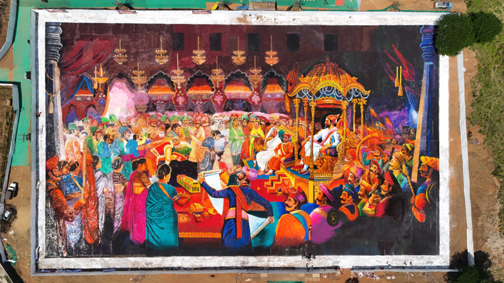 सव्वा लाख चौ.फुट एवढ्या प्रचंड क्षेत्रफळावर अवघ्या 70 तासांत 70 कलाकारांनी ही रांगोळी साकारून इतिहास घडवला. शिवराज्याभिषेक सोहळ्याचे भव्य दर्शन या रांगोळीतून घडवून छत्रपतींच्या वैभवशाली परंपरेला उजाळा देण्यात आला.